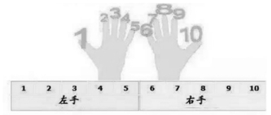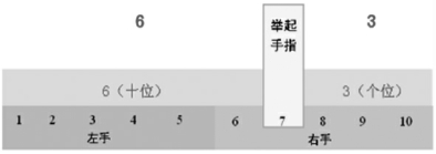 如要计算7×9,只需举起第7个手指,这时左边有6个手指就是十位数,右边有3个手指就是个位数,所以乘积就是63。