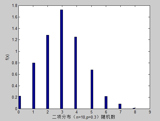 xlabel('二项分布(n=10,p=0.3)随机数');