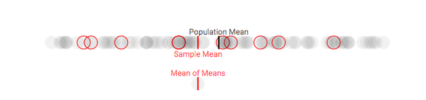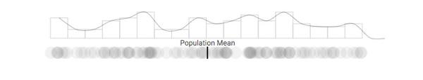 As it turns out, the shape of the population's distribution isn't what will help us understand our ability to make inferences about the population. Instead, let's consider what the distribution of sample means (also known as the sampling distribution) looks like. Use the button below to take multiple repeated samples, and see how the sampling distribution begins to take form.
