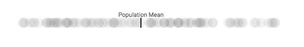 In order to grapple with such an important theory, we'll consider a simple hypothetical situation. Let's imagine that there's a populaiton of 100 people with a distribution of opinions that range from, say, 0 - 100 on some issue. Its simple to consider those views represented along a horizontal axis as follows, with the mean opinion of that population labeled and shown as a dark line: