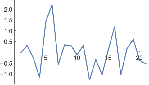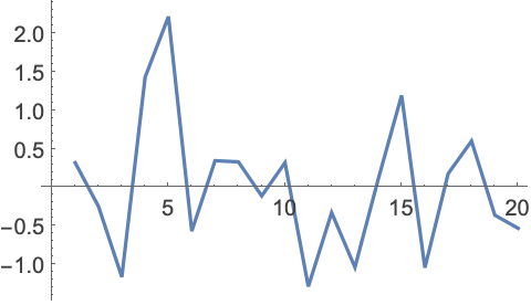 将 RandomVariate 与 NormalDistribution 联合使用,生成一个数值序列,序列由20个服从均值为0、标准偏差为1的正态分布的数值组成: