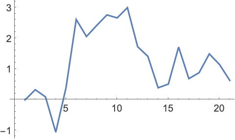 使用 Accumulate 将数据按依次叠加,然后用 ListLinePlot 对结果做图: