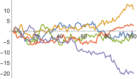 这里,用 Table 创建五个长度均为100的随机漫步,然后用 ListLinePlot 实现它们的可视化: