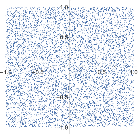 在由{-1,-1} 和 {1,1}界定的正方形内生成10,000个点: