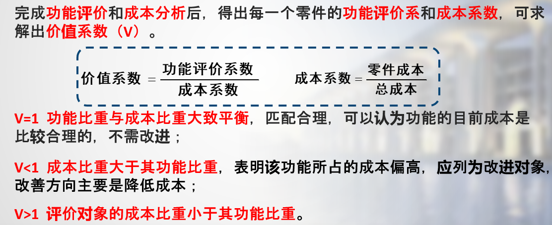 (2)计算公式:V=F/C V:价值 F:功能 C:成本