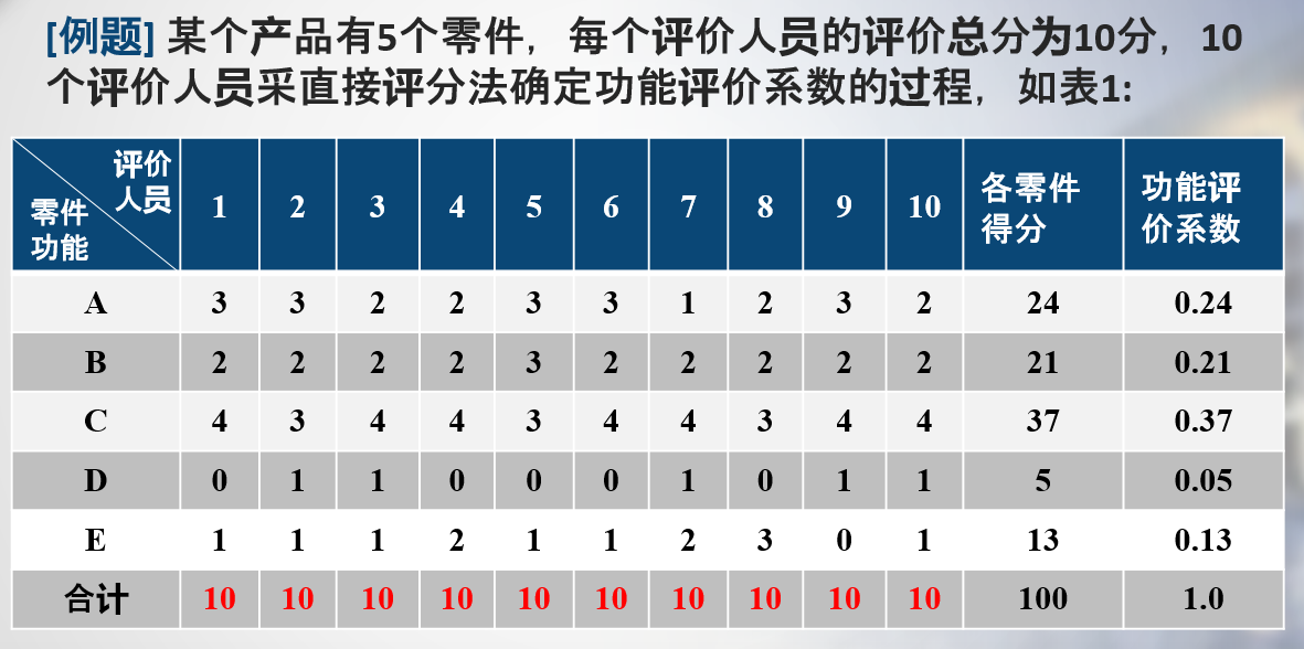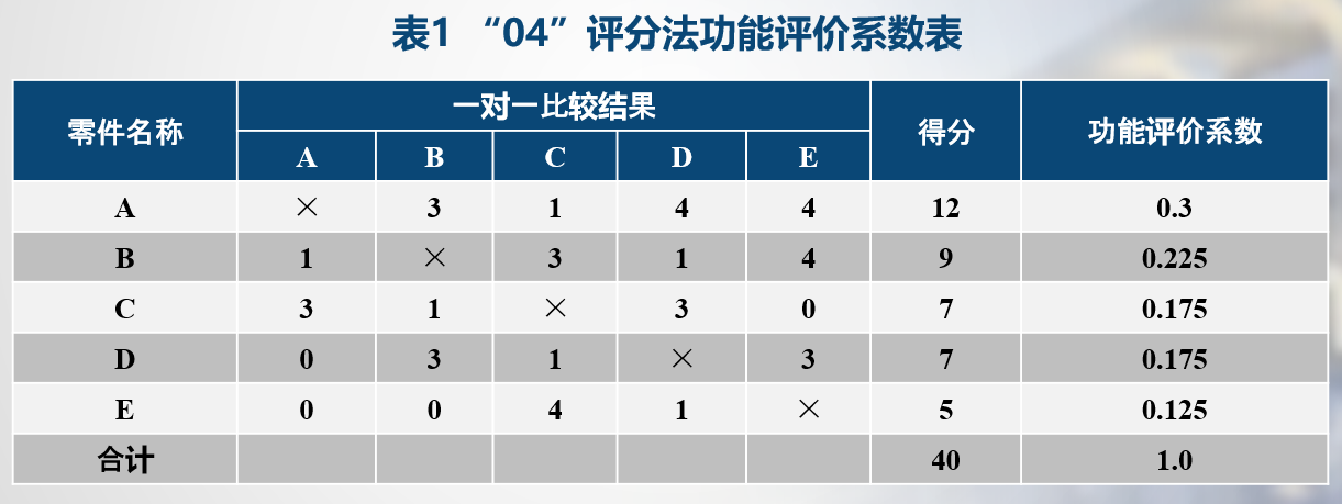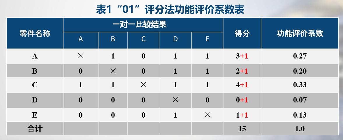 (4)倍比法:利用评价对象之间的相关性进行比较来 定出功能评价系数。