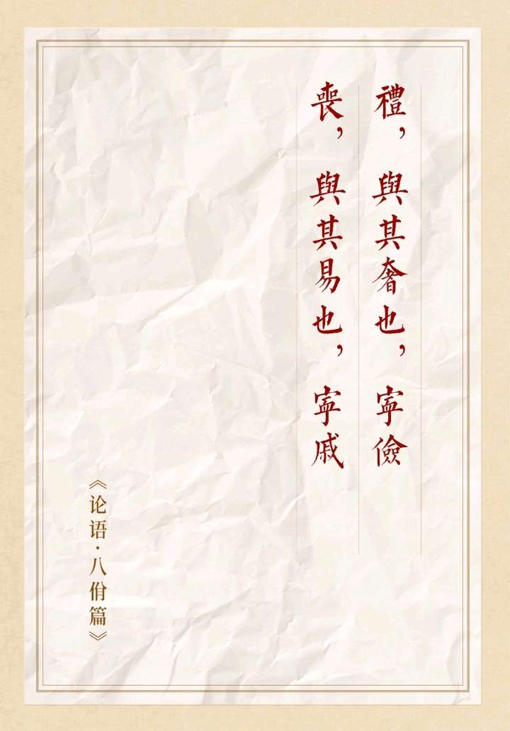 鲁国人林放问什么是礼的根本。孔子说:这个问题意义重大。礼,与其仪式奢华,不如俭约务实。对于丧礼来说,与其完备周全,不如内心悲哀。
