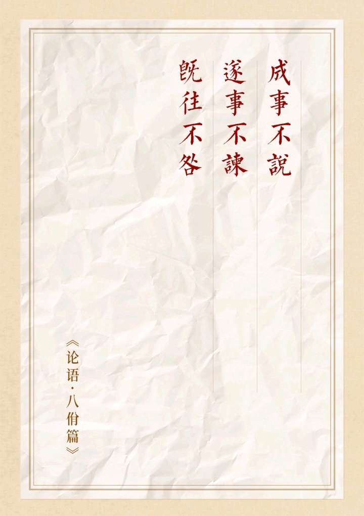 鲁哀公问宰我祭祀土地的神社牌位的事情。宰我回答说:夏代时使用松木,殷代使用柏木,周代时使用栗木,意思是让人民为之颤栗恐惧。孔子听说之后说:已经完成了的事情就不要谈论它,正在如愿而成的事情就不必阻挠它,已经过去了的事情(不论成败如何)就不必再追究它。