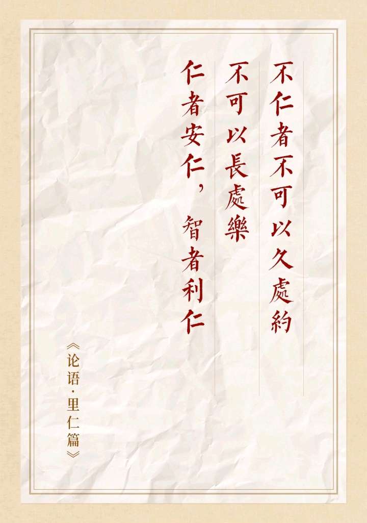 孔子说:没有仁德的人是无法长久处于贫困窘迫的环境中的,也无法长久处于安逸快乐的生活中。有仁德的人只有在施行仁德的时候才能心安,有智慧的人懂得如何利用仁德。
