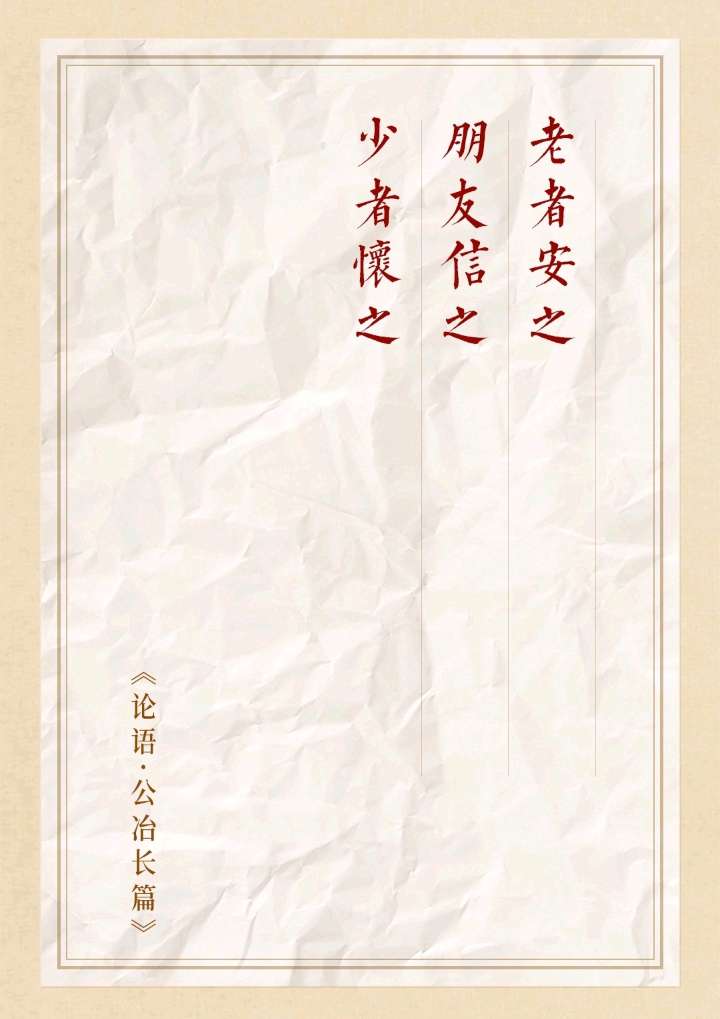 子路问:愿意听先生说一说您的志向。孔子说:让老年人都得到安养,让朋友们都彼此信任,让少年人都得到关爱。