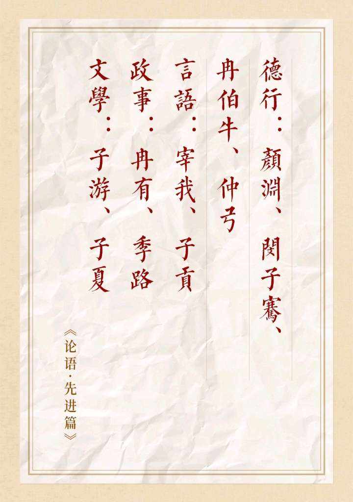 11.3 德行:颜渊、闵子骞、冉伯牛、仲弓。言语:宰我、子贡。政事:冉有、季路。文学:子游、子夏。
