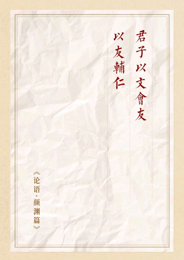 用文章学问来结交朋友,呼应着“有朋自远方来,不亦乐乎”的意思,具体阐发了交友之乐的内容。朋友之间相处,不是吃喝不分,不是对上眼了,不是臭味相投,而是要以互相帮助、磨砺、提携、培养仁德作为主要目的。这才是君子所奉行的交友之道。