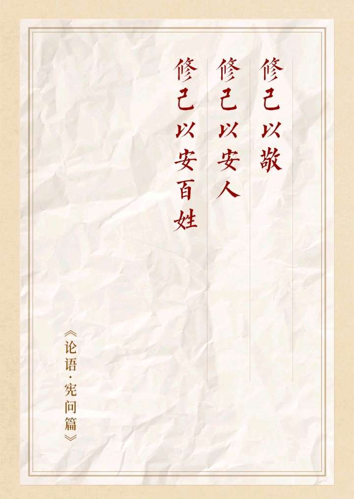 14.42 子路问君子。子曰:“修己以敬。”曰:“如斯而已乎?”曰:“修己以安人。”曰:“如斯而已乎?”曰:“修己以安百姓。修己以安百姓,尧舜其犹病诸?”