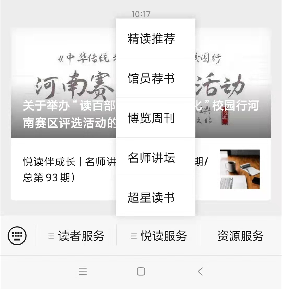 精读推荐、馆员荐书、博览周刊、名师讲坛四个栏目为我馆自制的悦读推广栏目。