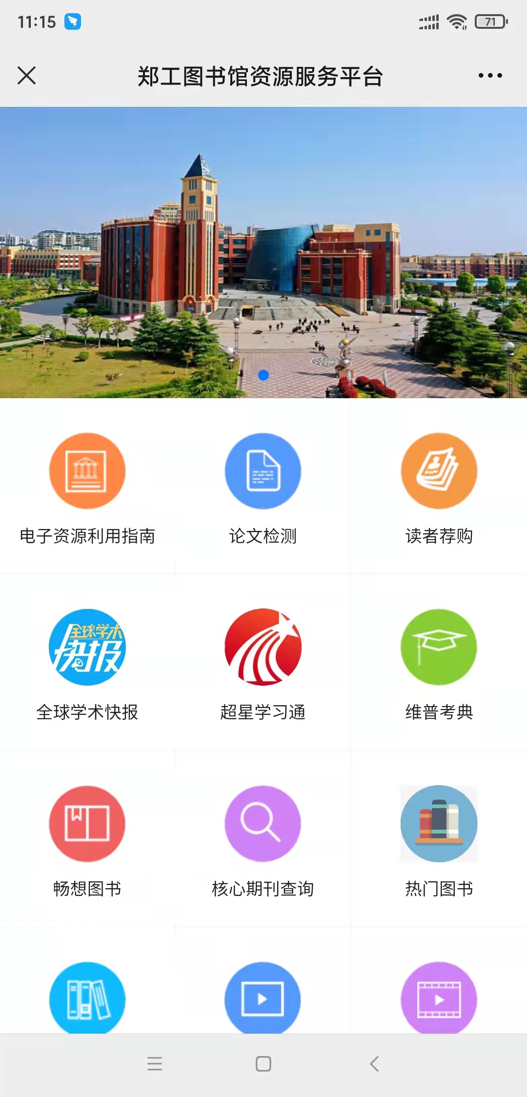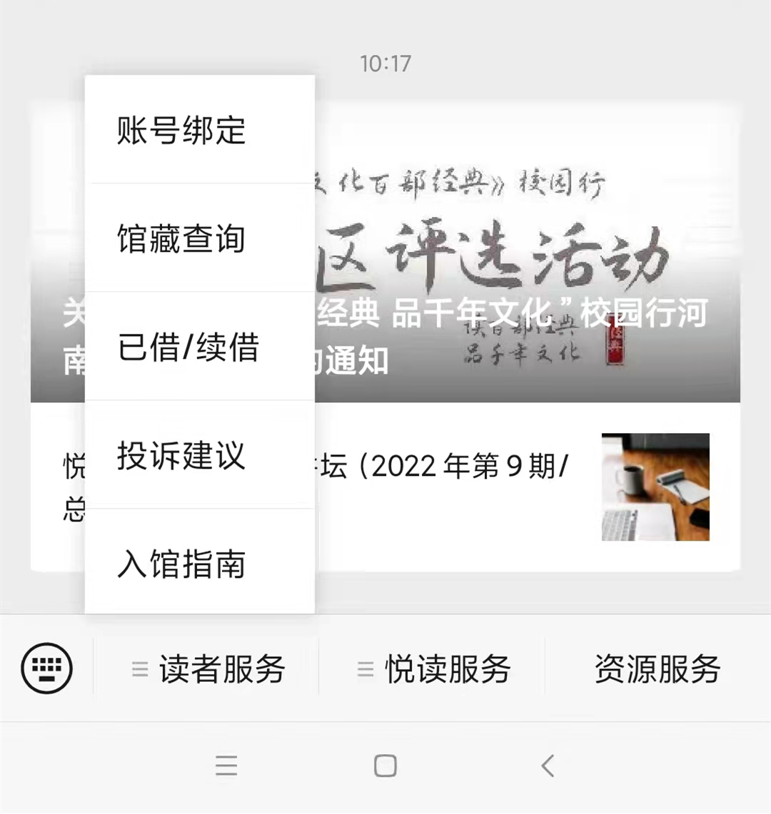 郑工图书馆(zg-tsg)为我校图书馆官微,主要这有“读者服务”、“悦读服务”、“资源服务”三个栏目。
