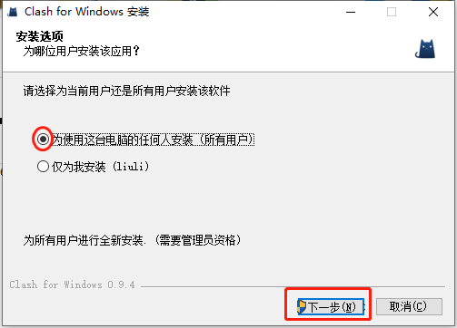 选择 为使用这台电脑的任何人安装(所有用户),点击 下一步