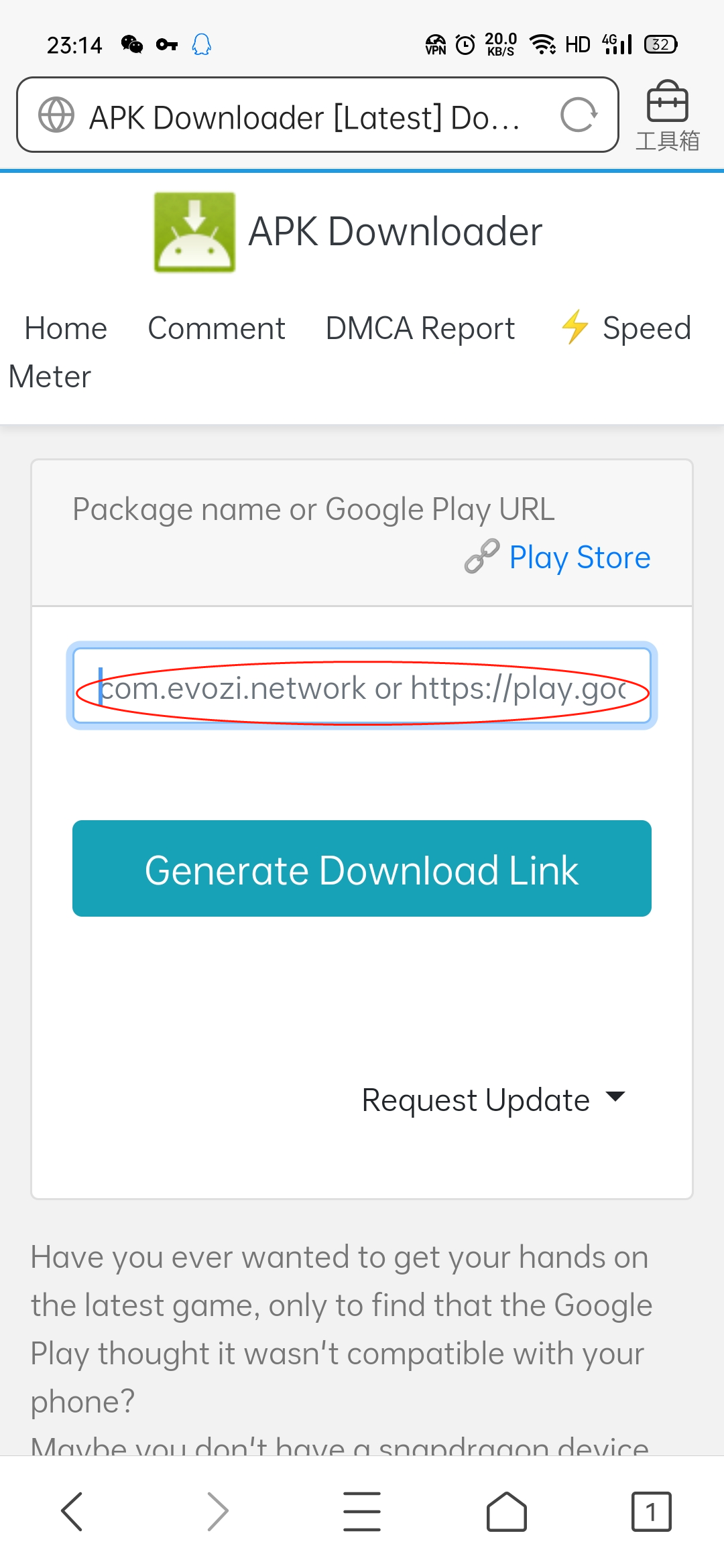 在浏览器打开 GooglePlay 软件下载工具 链接 https://apps.evozi.com/apk-downloader/?id=