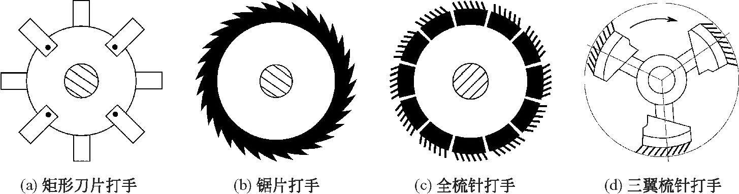 各种形式打手的横截面如图2-1所示。各种打手适用于不同的机型,用于加工不同的原料。矩形刀片打手(又称豪猪打手)打击力大,开松和除杂作用强,梳针打手和三翼打手能刺入纤维内部进行梳理除杂,作用较为缓和。