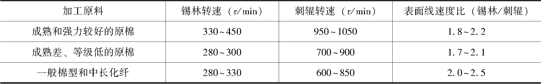 1.刺辊速度 刺辊在整个梳棉过程中,在清除纤维中的杂质和将纤维束分解成单纤维方面起着很大的作用。实践证明,梳棉机上的刺辊能将棉卷中70%~80%的纤维束分解成单纤维,并清除其中75%左右的杂质。
