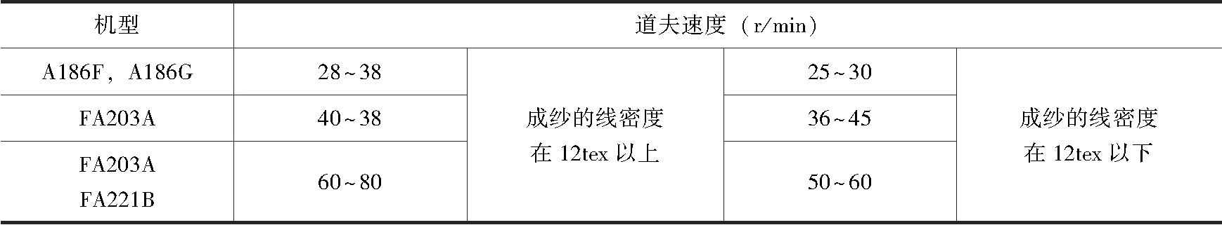 当采用增加道夫速度时,锡林盖板间的纤维量没有增加,道夫自锡林表面转移的纤维量增多,锡林表面上残存的纤维量较薄,因而锡林与盖板间的梳理条件较好。普通弹性针布梳棉机的产品质量以轻定量快速度、较重定量慢速度为优。但生条定量过轻,对质量也并不太有利,且会增加生产成本。梳棉机道夫速度的参考范围见表2-23。