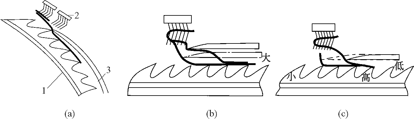 如图2-2(a)所示,当盖板上的长纤维行进到盖板锡林工作区的最前两根盖板时,因纤维较长而易于被锡林针齿握持,不易成为盖板花。如前上罩板与锡林的隔距小,则纤维被前上罩板压向锡林而被锡林抓取,使盖板花减少,反之隔距增大则盖板花增多,如图2-2(b)所示。当锡林与前上罩板间的隔距增大时,不仅盖板花率增加,而且盖板花中含有较多的良好纤维。如拿掉前上罩板,在盖板上就会形成非常厚的棉层。