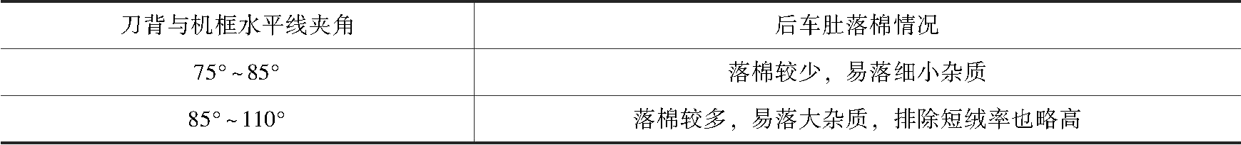 此区的除杂通常这样掌握:在第一落杂区中尽量多落一些较硬、较大的杂质,如果要回收纤维,应充分利用第一落杂区本身的三角地带的气流;而在第二落杂区(除尘刀至小漏底间的距离)主要再设法排除一些细小杂质和部分短纤维,并不希望在此区内回收第一落杂区中落下的长纤维。这样可获得较高的落棉含杂率和除杂效率。与此相反,若第一落杂区中给棉板上无除杂面,除尘刀安装倾角又较大,结果是后车肚落棉率高,落棉含杂率低,大部分纤维与小杂质吸入小漏底的入口内,因此棉网中棉结杂质数也较多。除尘刀安装角度可参照表2-26。