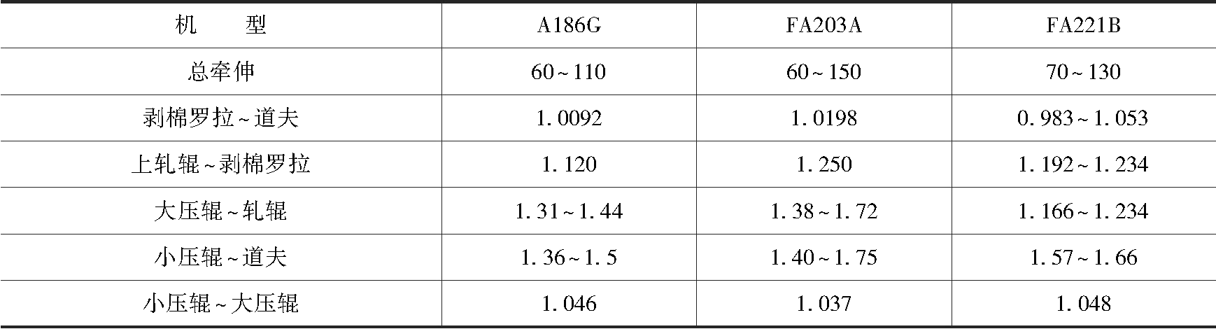 梳棉机总牵伸倍数及部分牵伸倍数的配置示例见表2-27。
