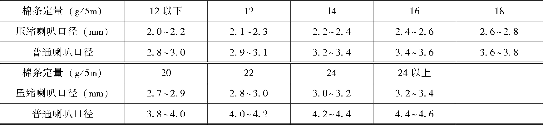 喇叭头口径大小主要根据棉条定量而定,合理的口径可使棉条紧密光洁。并条机上使用的喇叭头口径见表2-42。