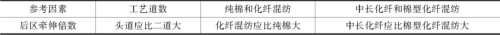 4.后牵伸 主牵伸能力大,后牵伸倍数可适当减小。后区牵伸的配置可参考以下因素(表2-33)。