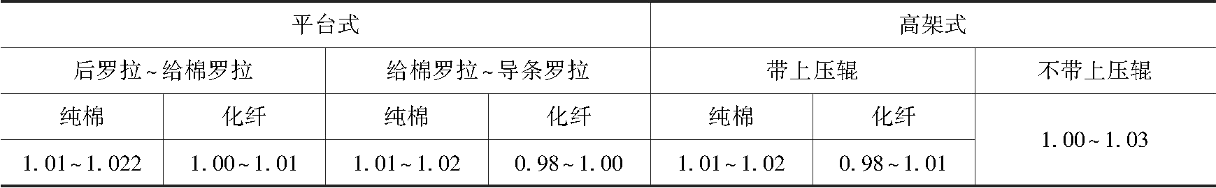 (2)后张力牵伸。后张力牵伸(导条张力牵伸)与棉条喂入形式有关,主要应使条子不起毛,避免意外牵伸,使棉条能平行顺利进入牵伸区为原则。后张力牵伸倍数可参考表2-36配置。