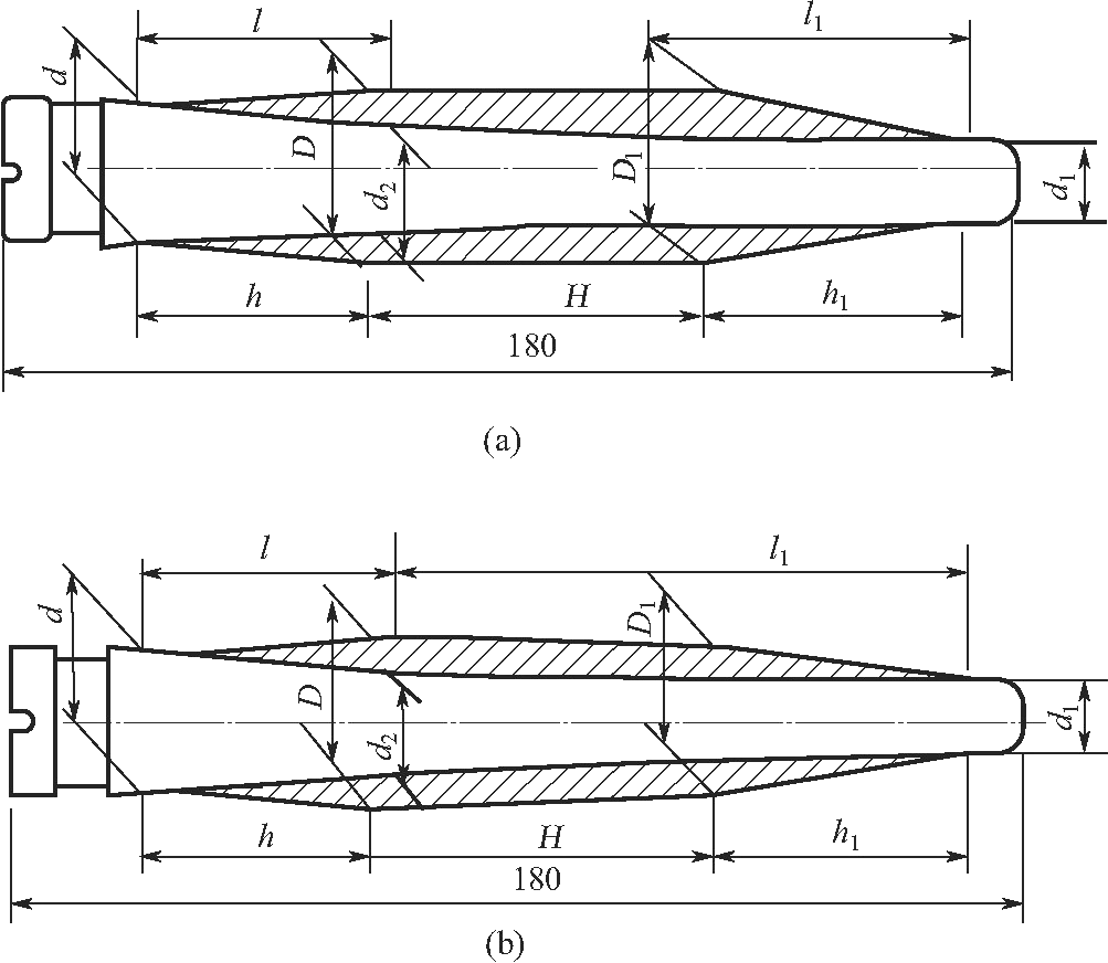 一般经纱、纬纱管的卷装形式如图3-1所示。其中,图3-1(a)所示纱管中部为圆柱体,D=D1。图3-1(b)所示为中部是上小下大的圆锥体的纬纱管卷装,两种纱管的卷装体积计算有一定误差。以下为根据图3-1(a)进行的纱管卷装计算。