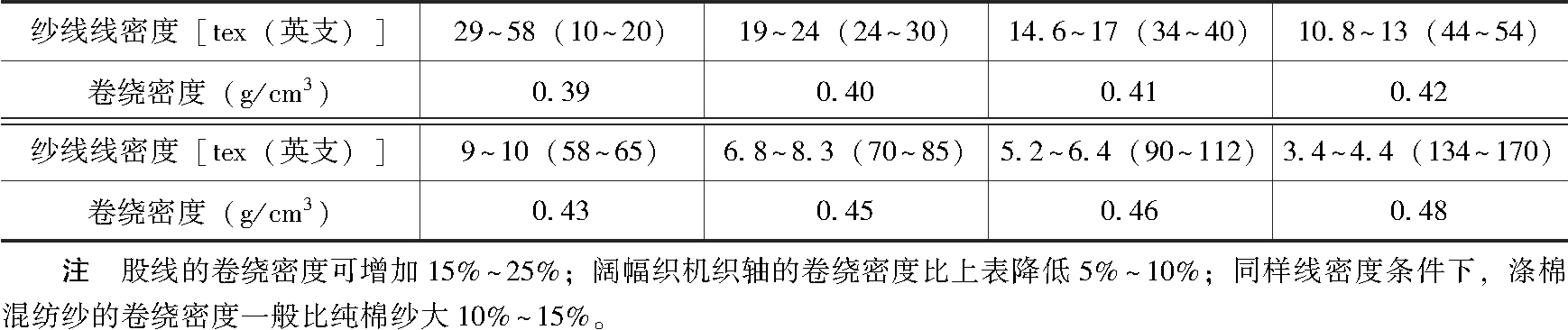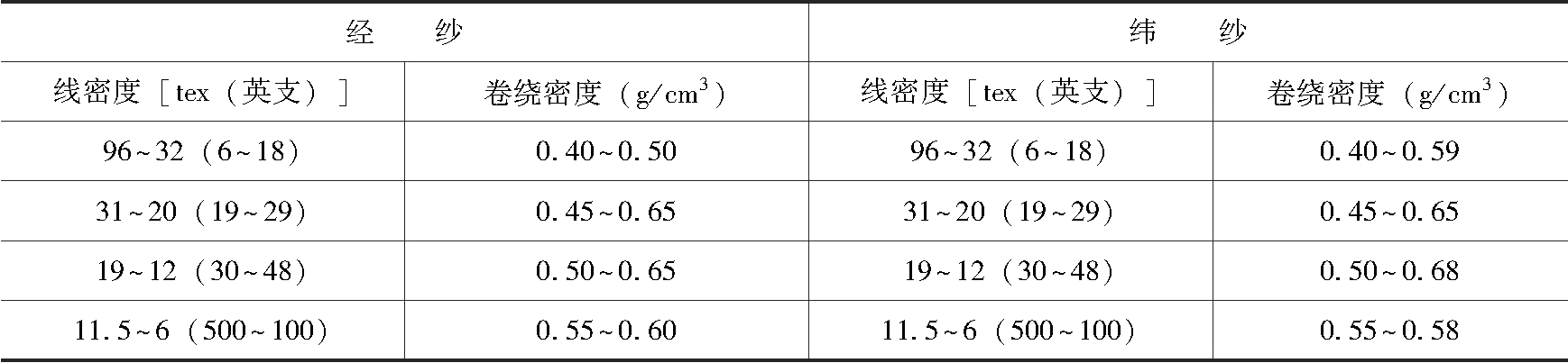 织轴的卷绕密度取决于纱线线密度和卷绕张力的大小。棉纱织轴卷绕密度可参考表3-13。