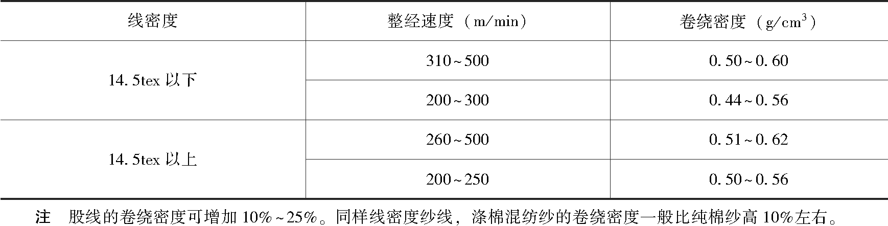 整经轴的卷绕密度随经轴的加压形式、车速、纱线线密度、张力盘重量的不同而异。棉经纱经轴卷绕密度一般可参考表3-14。