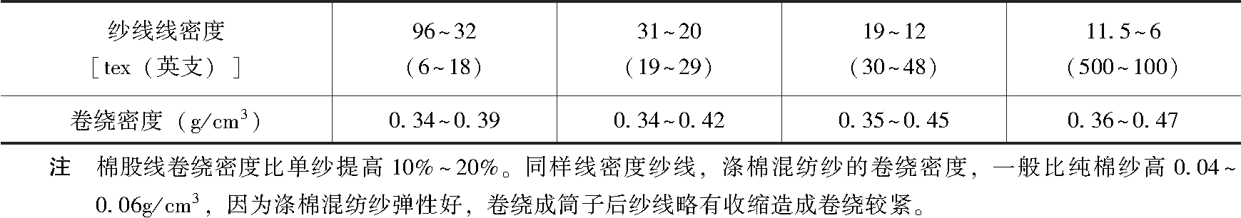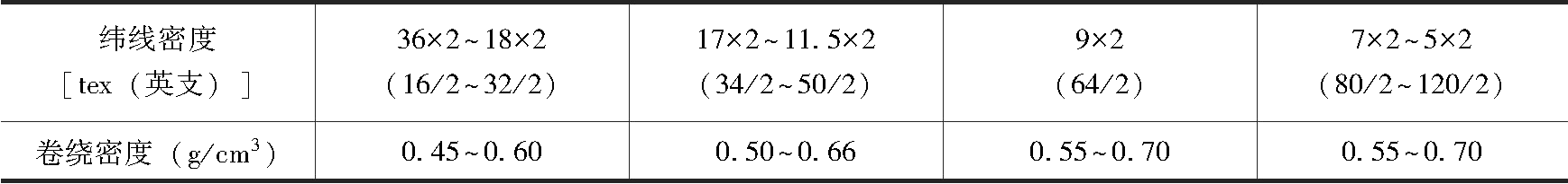 卷绕密度γ是一个与纤维原料、纱线粗细、捻度、回潮率及卷装张力等因素有关的数值。卷绕密度γ通常是根据长期试验的统计数据确定的。在设计新产品时,有时估算卷装绕纱长度需使用式(3-35),为了方便起见,一般只按原料类别和纱线线密度给定γ值的大致范围。
