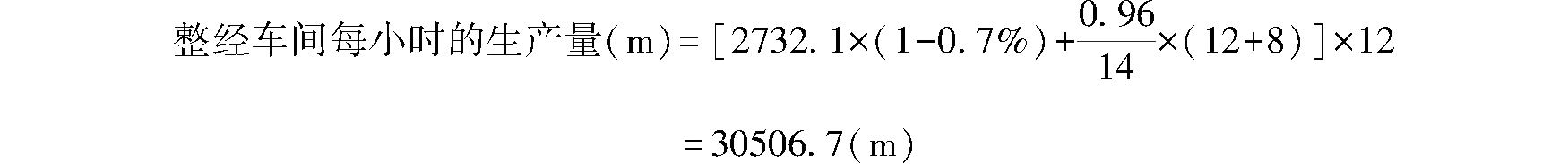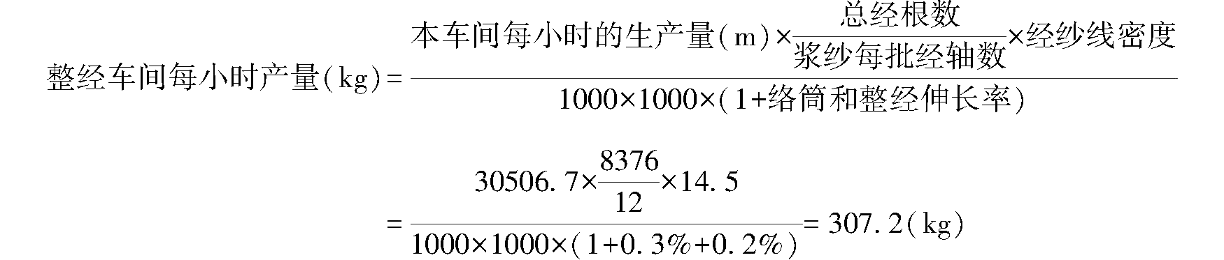 例8 接前例,假设每批经轴浆出的织轴数是14,浆纱了机白回丝12m,浆回丝8m,浆纱每批经轴数为12个,求整经车间每小时以“m”为计量单位时的生产量。