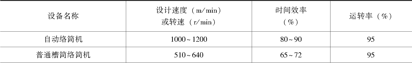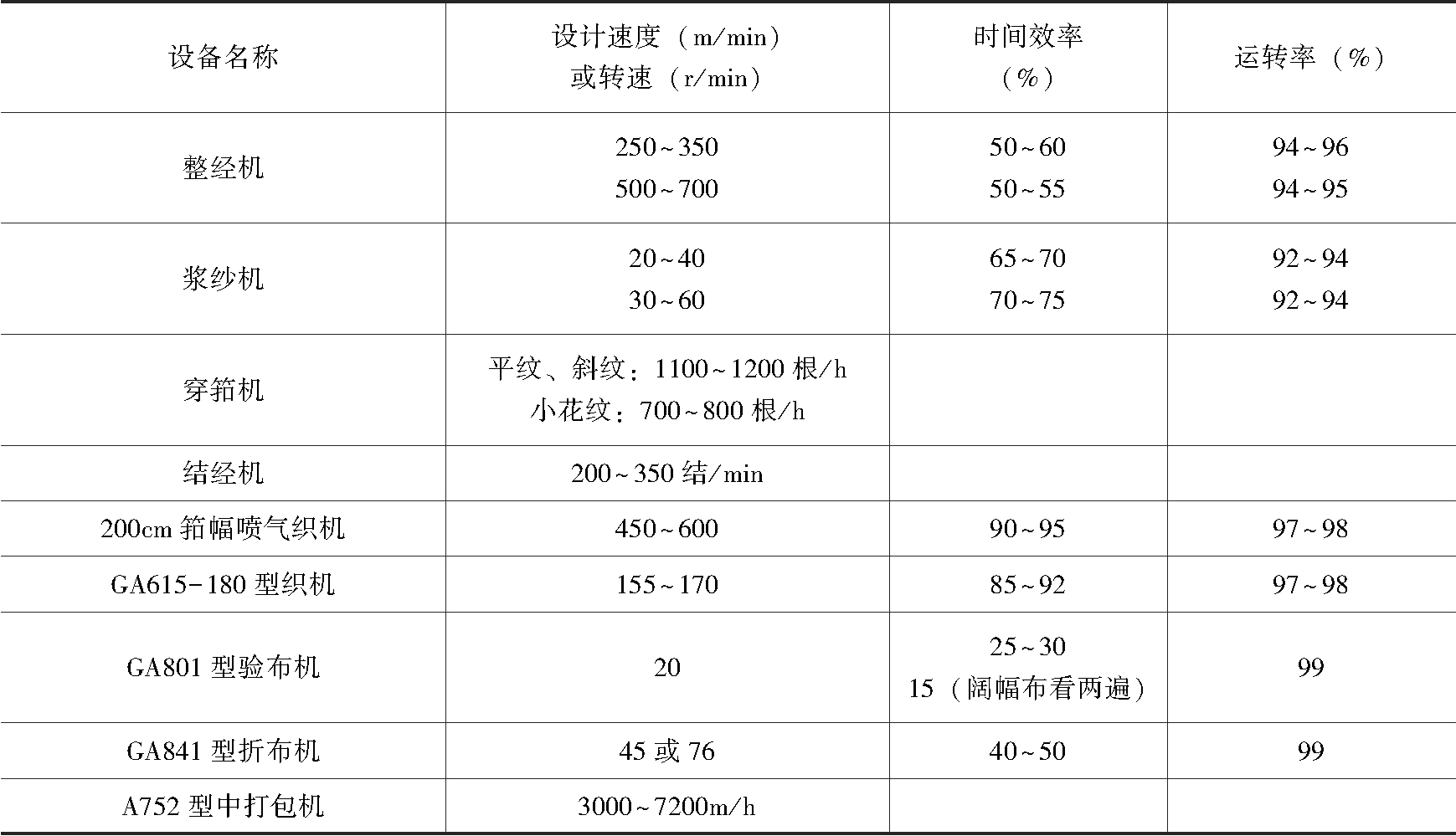 对织部各车间的生产进行供应平衡,就是计算各工序的生产量、经纬纱的耗用量及纺纱厂需要供应的经纬纱量。计算各工序的生产量时,要根据各种机器的速度范围选择一种速度,然后根据经验或统计资料选定时间效率、机器运转率。织部工厂各工序常用的设备型号、速度、时间效率、运转率见表3-18。