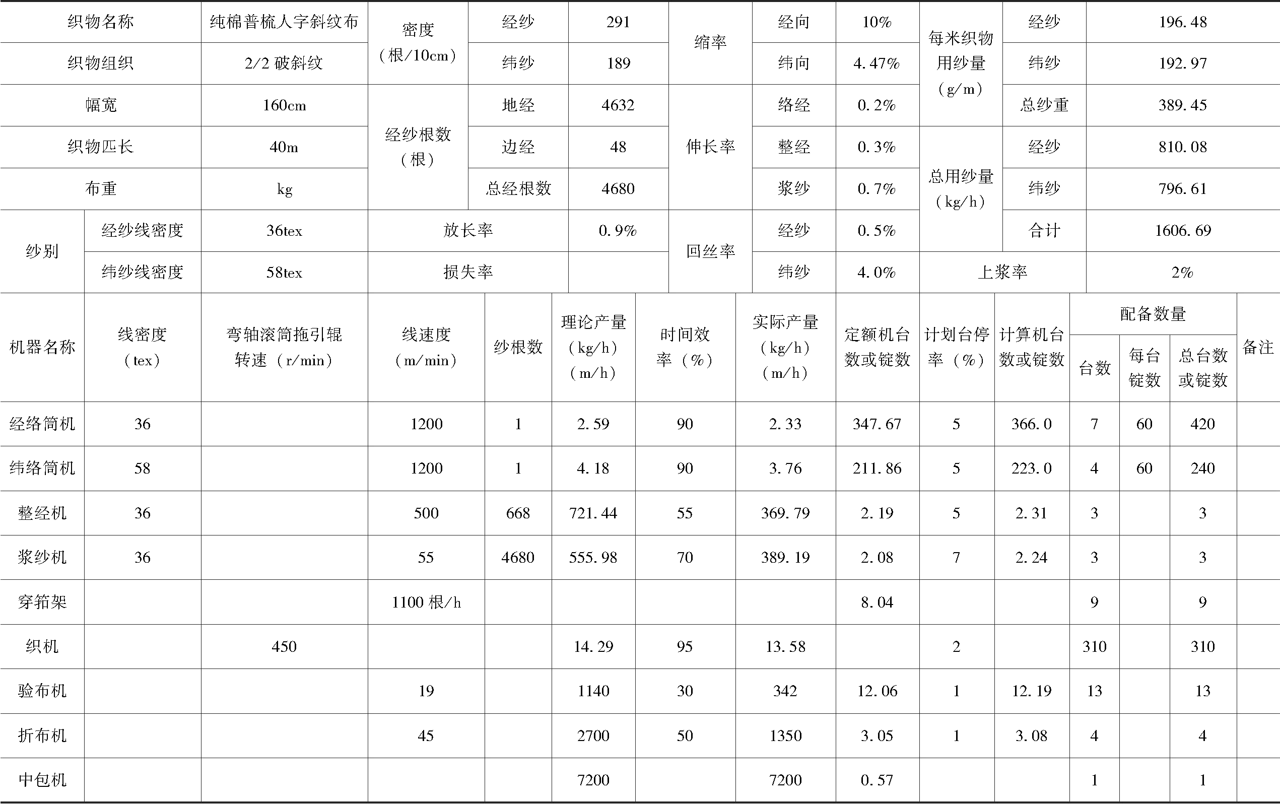 表4-34 36×58 tex纯棉人字斜纹布工艺设计及机器配备表