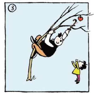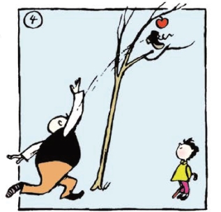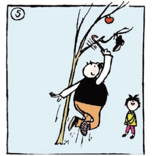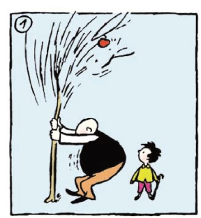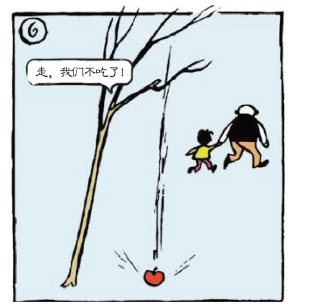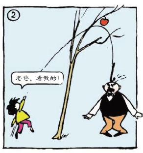 爸爸用力摇晃树,苹果却还不是掉不下来。