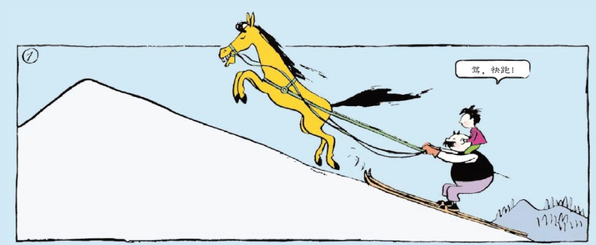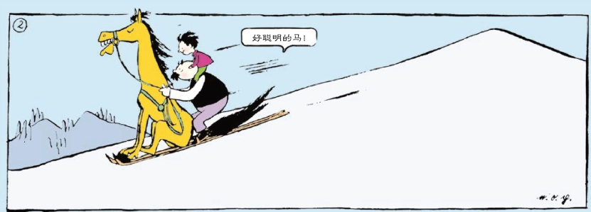 下山时,马儿和父子俩一起坐上雪橇滑下山去。