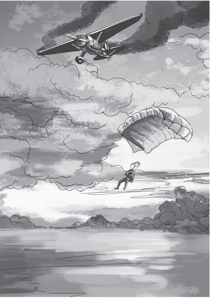 “然后我跳出了飞机。我没跳好。我看到自己在旋转。我怕降落伞打开得太早,把我绕进去了。我等着下落的状态稳定一点,噢,我等了好久……”