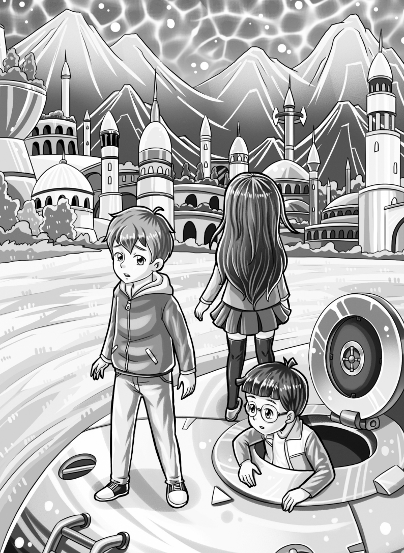 当张文昊、叶婷丽和杨念打开顶部舱盖钻出潜水艇时,他们看到周围是一座巨大的城市。群山环抱着圆环形的城市,森林和绿草布满山间和荒野。
