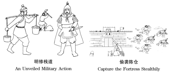 【出处】《三十六计》第八计:示之以动,利其静而有主,益动而巽[1]。《史记·高祖本记》卷八:“八月,汉王用韩信之计,从故道还,袭雍王章邯。邯迎击汉陈仓,雍兵败……”