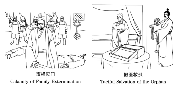 There were two loyal friends of the ZHAO's family named GONG-SUN Xu-jiu and CHENG Ying.They planned to rescue that only child of the ZHAO's family.GONG-SUN Xu-jiu said to CHENG Ying,“We must find another baby secretly to replace the ZHAO's baby,then I take the substitute one to abscond to the Shou-yang Mountain.You go to inform TU An-gu against me about the orphan.Only in this way can we stop TU An-gu from killing for the ZHAO's baby,and then we can help the princess and her son out of danger.” CHENG Ying agreed on the plan.