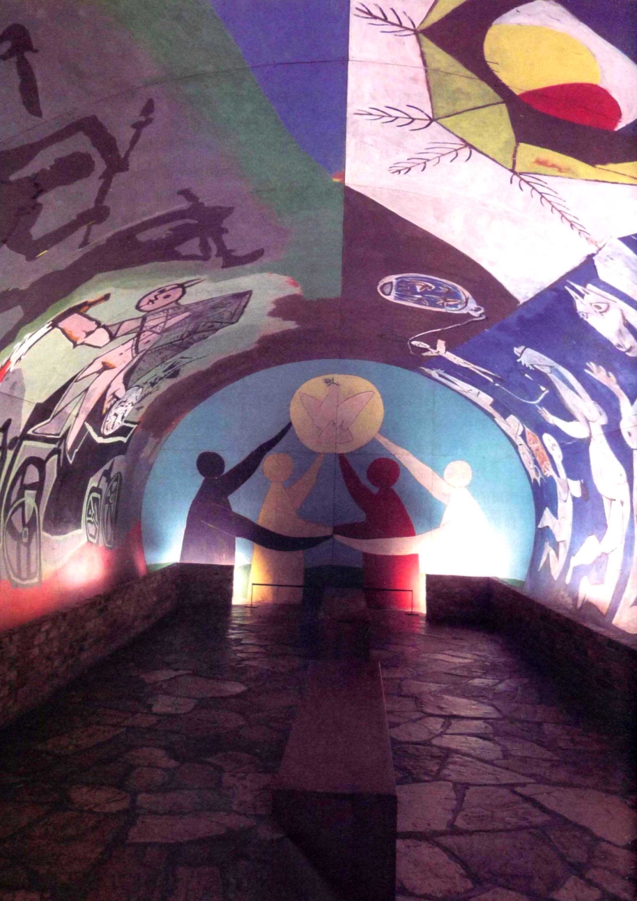 这座13世纪的罗马式老教堂,一侧的祷告室由大块的石头砌成,内部是带有罗马时代特征的拱形穹顶,后来被用作避难所。居住瓦洛利斯期间,毕加索一直幻想能将这个地方改建成一座不分宗教的、祈愿和平的庙宇。1951年,当地的陶瓷匠们在这个大石头建成的穹室里为他庆祝70岁生日,也就是在这个时候,坐在穹洞中看四周的墙面走着美妙的弧线,毕加索顿获灵感提出为穹室做壁画的想法。