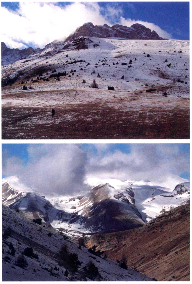 如今六个避难屋,只剩下了两个。听说我们是寻拿破仑的足迹来的,陪伴我们的萨拉二话不说,带我们朝高的挪野山顶峰进军,去看那两个拿破仑避难屋其中的一个。当地的山,大多数被称为“Col”,就是领子的意思,因为它们形状都十分标准,山与山之间组成一个个巨大的“V”字,犹如衣服的领子。该山群出现于1.8万年前的末次冰期,山顶常年被白雪覆盖,有如冰河战士般,由冰雪盔甲武装,任世事循环轮回,一副我自岿然不动的神颜。而半山腰里,则是另一番光景,沾了地中海气候的边,人们主要靠庄稼和畜牧来维持山里的生活。香索(Champsaur)被当地人用相近的法语发音(Champs d'or)解释为“金色的田野”,就是为了表达它们耕种农产的传统。一到收获时分,金色的麦浪随风翻腾,宽阔的农地上,常年堆着一卷卷金色的麦垛。因此,在这里如果拍到这样一张照片,一点都不足为奇:奶牛成群散布在碧绿的草坪上,农屋边堆着金色的麦垛,多彩的野花摇曳在湛蓝的天空下,再看背景——却是云雾缭绕、白色静穆的大雪山。