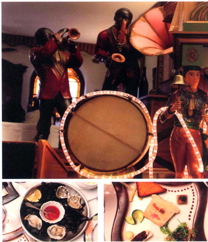 走进“驿站饭店”,犹如时间倒流,饭店布置尽量还原“法兰西号”,走的是法国70年代都会风格的路线,一台立式带有木偶人的放声机尤其吸引眼球。恰好放声机旁的软沙发座有几个空位,我心满意足地坐在彩色木偶人旁边。还没来得及仔细端详,一大盘新鲜牡蛎被摆在高架托盘上送到面前,伴有切片柠檬和洋葱红醋。对于酷爱牡蛎的我来说,这是最好的开场,二话不说挤上柠檬汁,端起一瓣轻轻吸吮,一股新嫩滑爽之感,随微仰的脖颈溜进肠胃,留舌尖上的味蕾仍沉浸于海洋的回味。这时候,大厅里已经座无虚席,突然身边的大型放声机亮起彩灯,那一个个木偶如经久沙场的演员,待观众坐满后才活动起来,各自拾起他们吹拉弹唱的乐器,一场现场音乐会在两声击锣后开始。随着欢快的音乐,美食一道又一道如约而至: