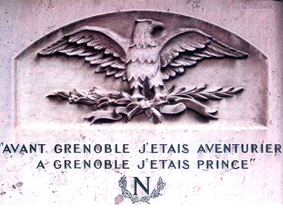 拿破仑生命的最后六年,在英国圣赫勒拿岛上度过,他时常面朝大海,遥想当年。四周是一片无尽的寂静,只有海浪声阵阵,显得尤为响亮,隐约间似乎又听到当年人们对他的呼唤。因此,他写下这句话,后来在格勒诺布尔广为流传:“格勒诺布尔之前,我是个冒险者;到了格勒诺布尔,我则成为王子。(Avant Grenoble j'étais aventurier,à Grenoble j'étais Prince.)”