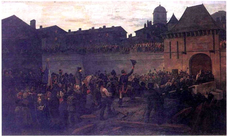 而这边拿破仑的士兵,及拥护者们等不及了,他们向门头涌去,势头如一支射出后回不了头的箭,不为皇帝把门撞开誓不罢休,门上的一条木栅栏顷刻间被弄翻。这时,拿破仑骑着马向门头靠近,他向大家示意平静下来,然后拿出他的鼻烟壶叩击城门,并通过城门的收发口,向胡斯上校递上请求开门的指令。没想到,胡斯上校义正言辞地回答道:“我只接受我的上级的指令。”“我马上就会辞了他的,”拿破仑说道。“我遵从我的义务与责任,我只听从于总督,”胡斯坚持道。好在拿破仑不是一个小心眼的人,胡斯这份对于本职的忠诚不移,恰好是他最器重的军人素质,进城立权后他不仅没有怪罪胡斯,还好言相劝将他纳入自己的部队。
