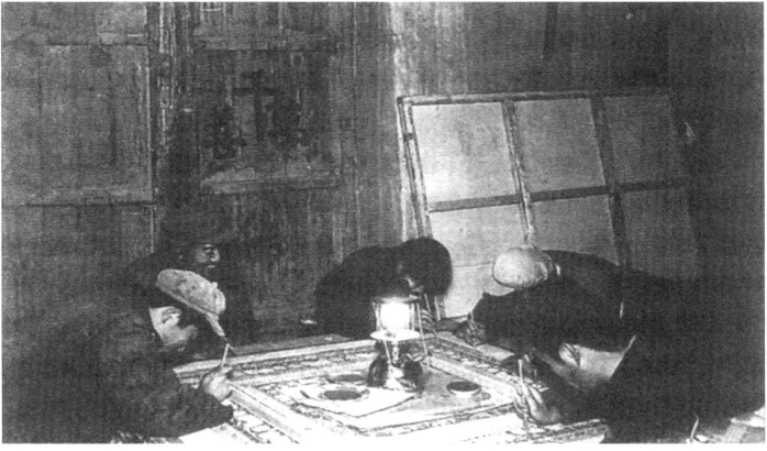壁画临摹的手段,在这一时期内也相对提高。由整理临摹、复原临摹向客观临摹发展。为了保质保量,根据情况,临摹时或由一人单独起稿,或几个人分片包干,但勾墨线、着色都要严求一致,每到月底,点上汽油灯,大家聚坐一处,将临品挂在窟壁原画旁,由沈福文教授或常书鸿评讲,切磋技艺,提高水平。这样,几年之内共临摹壁画近千幅。1948年南京展出时就是从其中选辑出五六百幅的。