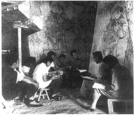 张大千敦煌壁画摹本在重庆中央图书馆展出时,山城为之轰动,一来是张大千名声大,二来这些展品是张大行率子弟门生举家在敦煌面壁近三年的心血之作、得意之作,使人们大开了眼界,所以观者如堵。段文杰更是如痴如醉,沉浸在高度的艺术享受里,以至于大清早步行十余里路排长队,用50元法币买得一张门票。面对近百幅摹本,段文杰不忍离去,绚丽的敦煌艺术瑰宝,使他目眩神迷,特别是敦煌壁画中那种喷薄而出的人的生命的律动,一反中国传统文人山水、花鸟的淡泊超然,使段文杰拍案惊奇。一千多年前的人物画,在无名画师笔下,竟表现得那么生动传神,这不正是自己梦寐以求的艺术表现力吗?蓦地,段文杰产生了亲自去敦煌朝圣的强烈欲望。这种冲动,简直神差鬼使一般,让段文杰急不可耐。1945年,刚从艺专毕业的段文杰,相约了两个同窗学友, 自筹路费,离开重庆,前往兰州,打算再从兰州转赴敦煌。其时,段文杰新婚不久的爱人龙时英还在重庆教书。段文杰根本没有想到,下一次来重庆探亲,与龙时英团聚,已是11年后的事了。依段文杰当时所想,去敦煌除了学习人物画之外,也就有了一份工作,干上两三年,功德圆满,也就该回家了。段文杰的这种想法是很朴实的,不存在任何虚妄和美化成分。常书鸿就不是这样,他说自己离开巴黎去敦煌,是因为看见了伯希和的敦煌画册,产生了强烈的保护意识云云,总使人觉得不很自然。